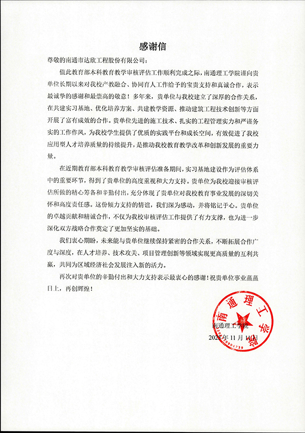 集團(tuán)近日收到南通理工學(xué)院的感謝信,對(duì)其在本科教育教學(xué)審核評(píng)估中的大力支持表示誠摯感謝。